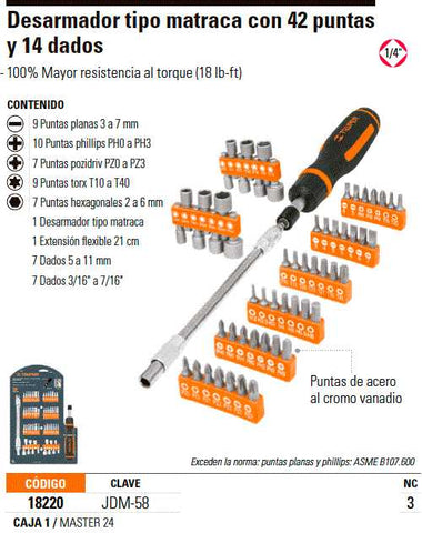 Juego de desarmador tipo matraca, 58 piezas Clave-JDM-58